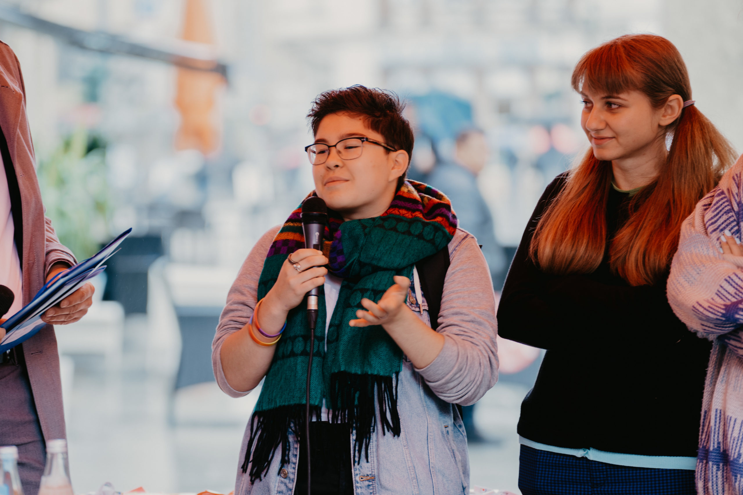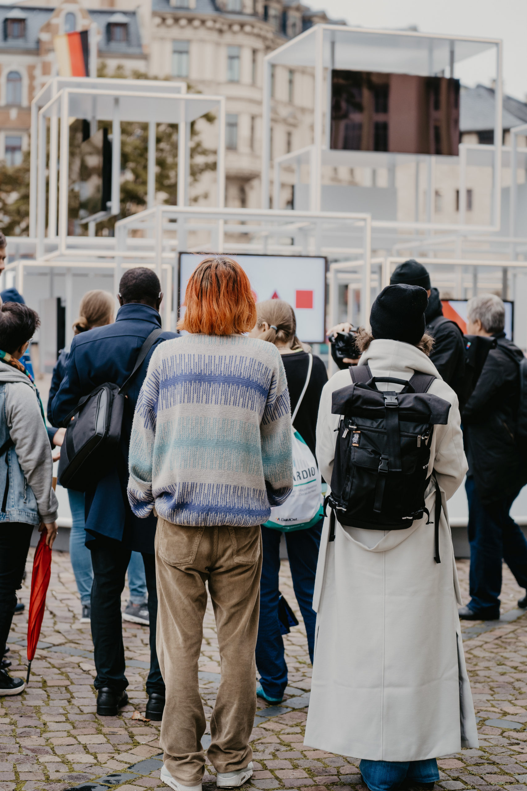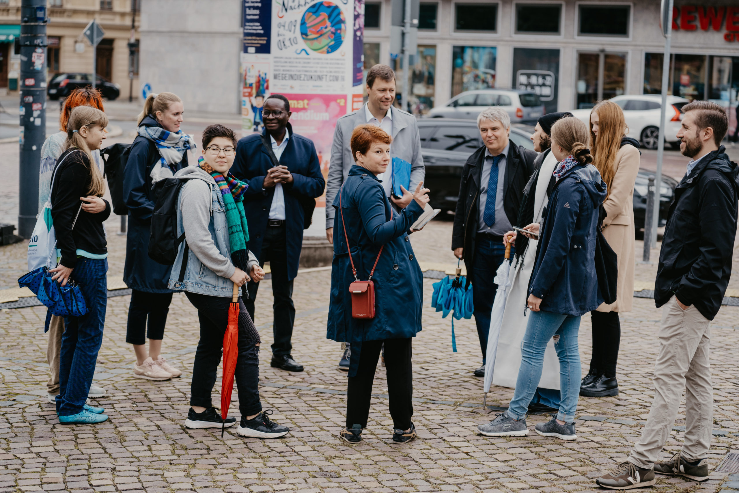 Gemeinsam starteten wir dann in eine eigens für die EinheitsEXPO entwickelte Sonderedition der Demokratietouren der Hallianz für Vielfalt. Romy Höhne , die die Tour für die App ActionBound entwickelt hatte, führte uns zu relevanten Orten der Demokratie in Halle. Über den Jerusalemer Platz, wo die historische Synagoge Halles 1939 niederbrannte, ging es zum Hallmarkt. Dort erwartete uns am Ausstellungsraum der Bundesregierung eine Premiere. Die Filme, die das Bundespresseamt eigens für die EinheitsEXPO über Demokratieprojekte aus Halle erstellt hatte, wurden hier zum ersten Mal vor Publikum gezeigt. Mit dabei auch ein Film zu unserem Projekt JUGENDSTIL*.