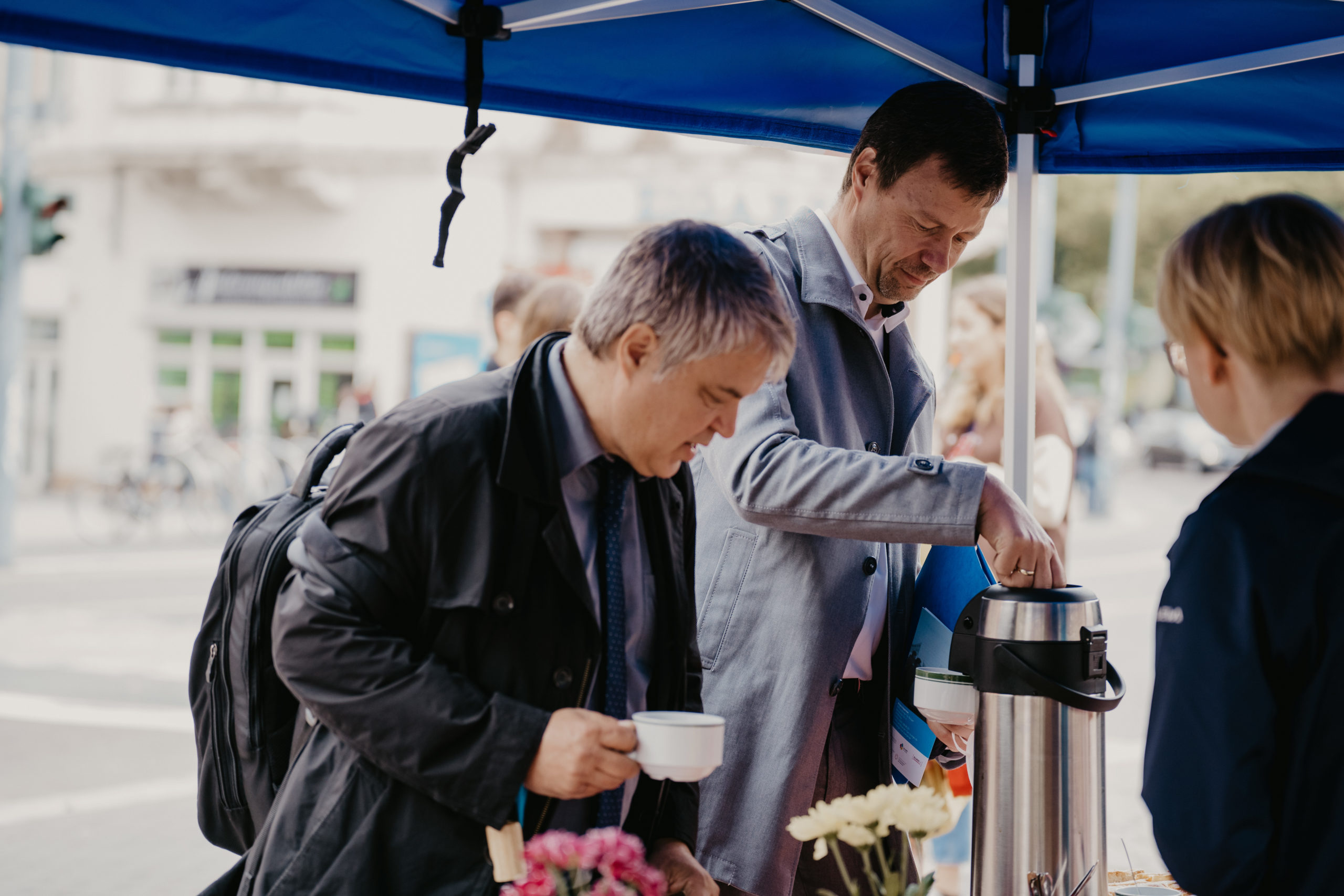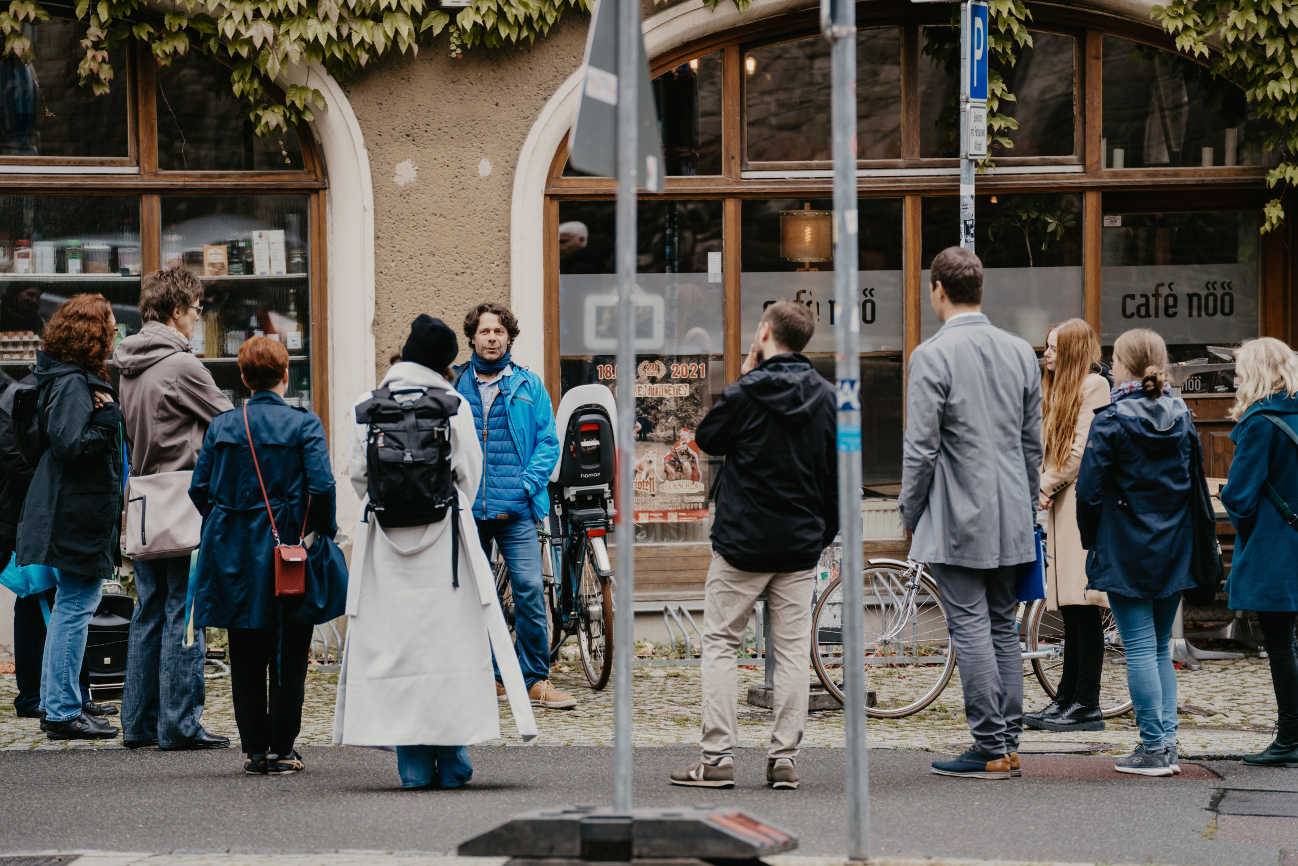 Am Haus der Reformbewegung übernahm Christof Starke, Geschäftsführer des Friedenskreis Halle, und nahm uns mit auf einen Zeitgeschichtlichen Stadtrundgang zu verschiedenen Orten des Engagements für Demokratie, Frieden und Vielfalt. Die Tour führte uns über die Marktkirche, Ort für Friedensgebete 1989, den Marktplatz, Schauplatz der Montagsdemonstrationen, zurück zum Leipziger Turm. Dort hatte LAMSA e.V. eine interkulturelle Kaffeetafel aufgebaut. Hier konnte man bei einem Stück Kuchen z.B. über migrantische und nicht-migrantische Erfahrungen mit der Wende ins Gespräch kommen.