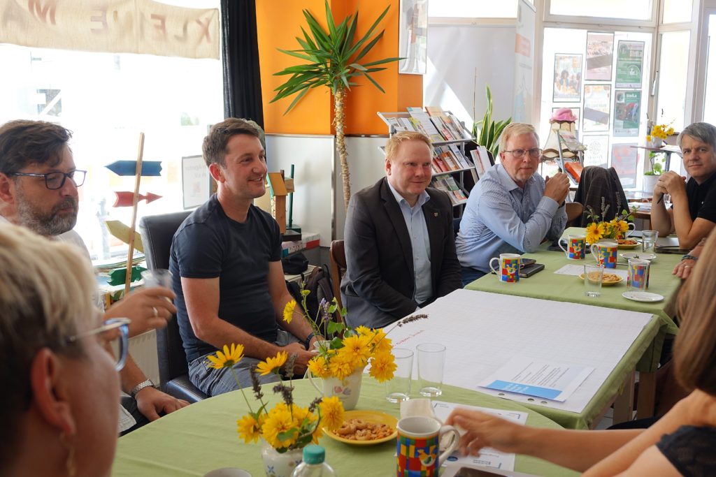 Zeit für den Roundtable „Engagiert für Demokratie – Zukunftswege Ost in der Altmark“ nahmen sich auch die Landräte des Landkreises Stendal und des Altmarkkreises Salzwedel, Patrick Puhlmann und Steve Kanitz, Stendals Oberbürgermeister Bastian Sieler und Salzwedels Bürgermeister Olaf Meining. Stendals Landrat fragte nach, wie verbindlich die geplante Kooperation von Zukunftswege Ost mit der Altmark sei. „Sehr verbindlich“, antwortete Stefan Vogt von der Freudenberg Stiftung. Eine Rolle spiele dabei auch das große Potenzial an gemeinnützigen Initiativen in der Region, die demokratische Werte fördern.